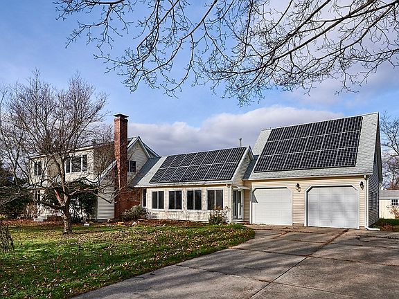Bells & whistles! Built in 1971 & remodeled in1990's & 2014, this value added, @2800 SF, 4-bedroom, 2.5 bath expanded Cape touts newer roof w/ owned solar panels for electric! State of the art heat pump & A/C system comprises forced air, main house unit, plus 4 mini splits to heat & cool areas. Besides vaulted ceiling sunroom/fam rm AND kitchen additions, added dormers on 2nd floor enlarged 2 bedrooms. Sunny MBR enjoys amazing mountain views & walk-in closet. 2nd BR touts infra-red sauna. Remodeled bath sports French shower, tile floor, claw foot tub & radiant floor heat. Enjoy versatility of formal LR w/ wood stove, family room w/ gas heater, 2 bedrooms + 1 bath on EACH LEVEL, oak floors, basemt. exercise room. Remodeled office w/ bamboo flr + new windows,1/2 bath & separate entrance over 2-car garage. Located on quiet, cul-de-sac w/ field views in Hadley. Bike path access closeby. Cape is between Amherst/UMASS & Northampton/Smith College, 5 min. to shopping district. Lots to love!