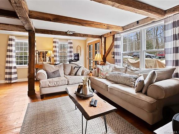 Antique country charm abounds in this storybook Colonial set on 2 peaceful acres with two barns and pool! The minute you step inside this one-of-a-kind home you're greeted with original exposed beams, rustic wide plank flooring and the cozy ambiance of two massive fireplaces with built-ins and wood-burning stoves. Nooks and crannies are around every corner, with hidden doorways to two separate amazing loft spaces, perfect as home offices or additional bedrooms. Main level living and family rooms, office/bedroom, full bath, plus a sunny kitchen and formal dining room. Upstairs you'll find three bedrooms and another full bathroom, plus two "secret" lofts. The beautiful yard features gardens and a new above ground pool with wrap-around decking. Two large outbuildings, including a barn and separate garage/workshop, perfect for the handy person or car collector. Convenient location for a down-county commute and just a few minutes to Bethel's schools and quaint and walkable town center with trendy restaurants, small shops and loads of community activities. All this in a park-like setting with privacy--make your home your retreat!