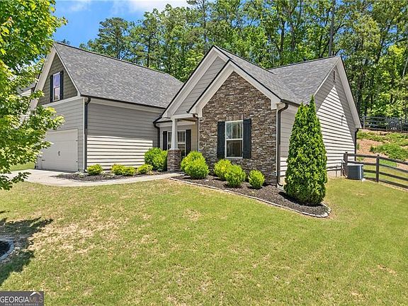 Just 1 mile from Old Town Dawsonville, this charming ranch home combines convenience and privacy in a sought-after location. Enjoy easy access to local shops, restaurants, the city park, and all the small-town charm Dawsonville is known for, plus quick connections to GA400, Highway 9, and Highway 53. Step inside to a welcoming foyer that opens into a spacious, open-concept living room, dining room, and kitchen. The kitchen features wood cabinetry, granite countertops, a breakfast bar, breakfast nook, and a pantry-perfect for both everyday living and entertaining. The primary suite is tucked away off the kitchen, offering a private retreat with a walk-in closet and a spa-like bathroom featuring a double vanity, soaking tub, and separate shower. Two guest bedrooms, a full bathroom, and a laundry room are conveniently located off the main living area. Upstairs, a large fourth bedroom provides endless possibilities as a guest suite, flex space, or home office. Outside, relax on the back deck and enjoy the peace and privacy of your own backyard oasis.