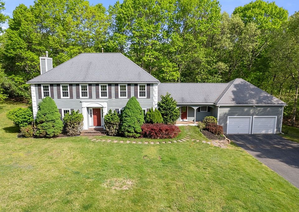 This STUNNING center entrance hip roof colonial is set back on a professionally landscaped lot in one of Sharon's most desirable neighborhoods, Tanglewood Estates.This beauty offers dramatic casual & formal living spaces perfect both in form & function. The large EAT-IN KITCHEN offers TONS OF CABINETS, PANTRY, BRAND NEW SS APPLIANCES, and opens to the GORGEOUS FAMILY ROOM with cathedral beamed ceiling and sliders to large deck. Perfect for entertaining! The first floor is completed w/ formal dining room, fire-placed front to back living room, office, half bath, and laundry. Upstairs, the magnificent OWNERS SUITE includes large walk-in closet and owners' BATH w/JACUZZI tub. Three additional GENEROUSLY sized bedrooms & full bath w/DOUBLE SINKS complete the 2nd level. METICULOUSLY MAINTAINED with STUNNING CURB APPEAL. Easy accessibility to the trails of Borderland State Park! If you're looking for a timeless classic in a perfect neighborhood setting, this is the one!
