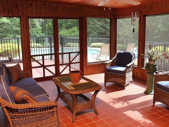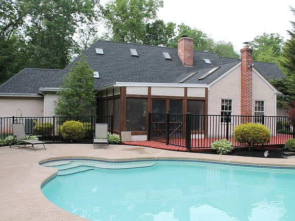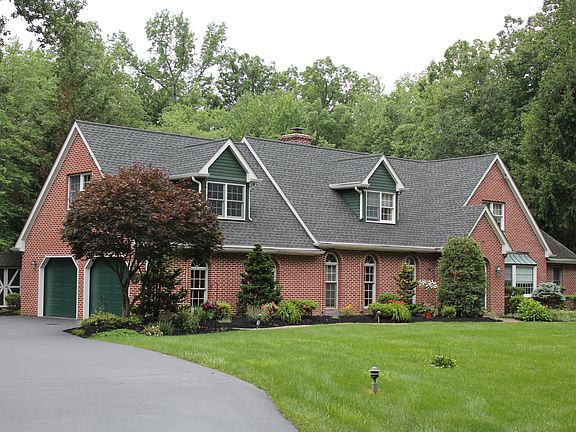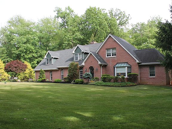 Architecturally unique.FIRST FLOOR MASTER BEDROOM......3 or 4 Bedrooms. 2nd floor has 3 finished rooms (1 bedroom or office is a WALK THROUGH) accessible through another bedroom or outside walk up attic. Custom built in 1987; Architect-Charles Dietterich, Brick Gabled Tudor design in front, Contemporary design in rear. Wonderful cul de sac location with 14 custom homes. This home is masonry (brick and "real" stucco); Moravian and Italian tile accents interior and exterior; First Floor Master Bedroom with oriel and large walk-in closet. County Square footage includes enclosed sun porch. Newer roof; Front portico entrance; New heating/AC unit; "real stucco" in rear; concrete basement is 4 ft high-used only for heater and plumbing BUT-Huge 23' x 15' floored-walk up attic for storage or work shop and/or expansion instead of basement. wrap around deck in rear; Easy walking neighborhood and very private; Secluded, wooded country views from most of home. Surrounded by open space in rear and walking trail nearby: Public sewer with the 1.75 acre lot; In-ground concrete pool-well maintained professionally and fenced; Beautiful trees-shrubs-walkways; Galley cherry kitchen with breakfast area; 2nd floor has a "walk thru office/playroom or 4th bedroom with access to attic or can be used as hobby space; Cathedral ceiling in family room; 2 fireplaces; First floor family room easily expanded into sun-florida room; Andersen-Pella-Peachtree doors, fan windows; Central Air on first floor; 20 x 25 Attached garage; Well water at present time, but public water in street for future hook-up if desired: Near town, Pizza Hut, Parks; Rt 309, PA turnpike, Rt 313, Rt 663, I-78; Easy commute north and south; Hardwood floors, and tile on most of first floor;. Spring stream on side of land. New Generator with 6 circuit manual transfer switch installed 2014 for back-up electric; Both brick exterior chimneys re-pointed in 2014; Newer dimensional roof, sun room roof, extra dormer in 2013; New Amana heat pump with central air recently installed in 2015.