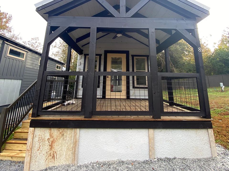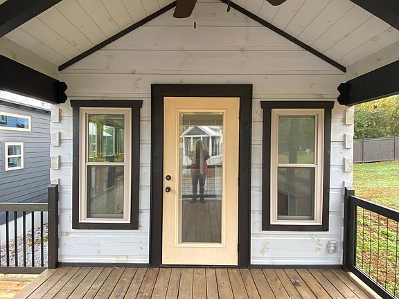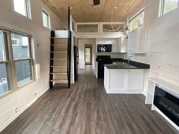 Enter this brightly light tiny home with vaulted ceilings, a modern wall unit fireplace, a fully equipped kitchen, washer and dryer, and a deck off the front and the back of the home. The loft can be used for a second bedroom, sitting area, workspace, or storage. The black appliances and countertop with the white wood walls make this space live big! The deck off the master bedroom has views of the lake. The community has lake access with a dock and also a shared firepit space. There is additional storage on the property for the tiny house tenants. There is an additional monthly fee of $100 and includes water, electricity, gas, sewer and garbage disposal. This home is move-in ready with first and last months rent. There is a pet deposit of $250.