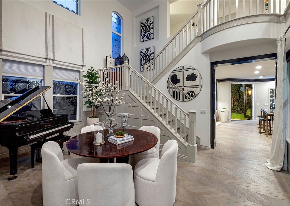 TV-featured Magazine- Quality designer model of a home in Irvine’s prestigious triple guard-gated Northpark community with French oak chevron wood floors, dramatic double-height dining room, open concept family room and abundant natural light. Tucked on a private cul-de-sac with 4 bedrooms plus office (optional 5th), loft, and first-floor guest suite. Custom details include wainscoting/paneling, elegant lighting and hardware, and refined millwork throughout. Spacious living areas flow to outdoor patios with stone fireplace and south-facing garden. The primary suite offers a spa-style bath with freestanding soaking tub, Carrara marble floors, mirrored wardrobe walls and dual vanities. Chef-ready kitchen features quality finishes and thoughtful design.