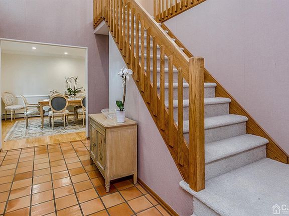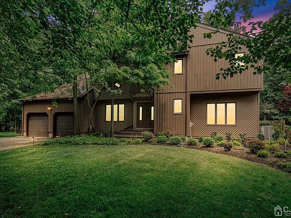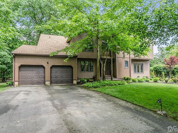 In a leafy North Brunswick neighborhood, this lovely 5 bedroom contemporary is an entertaining powerhouse, thanks to a finished basement with a separate office, a fireside Great Room, and an L-shaped Trex deck that backs to Hidden Lake Park. Elegance and sunshine fill molding-trimmed formal rooms. Skylights and a 2-story fireplace add up to an incredible feeling of spaciousness in the Great Room. Built-ins with a drinks area are so convenient to the connecting eat-in kitchen, updated with a new 5- burner range, double ovens, and dishwasher. Glass sliders lead out to the tiered deck and hushed, oak-lined privacy. The bedrooms include one the 1st floor, and 4 connected by the open landing. Two and a half baths include a skylit en suite for the main bedroom, where new carpet, volume ceilings, and French doors to a balcony create a true retreat. Commuters will be delighted with the mile-away location to major routes and a future train stop to NYC and Philly.