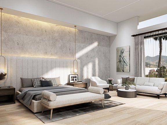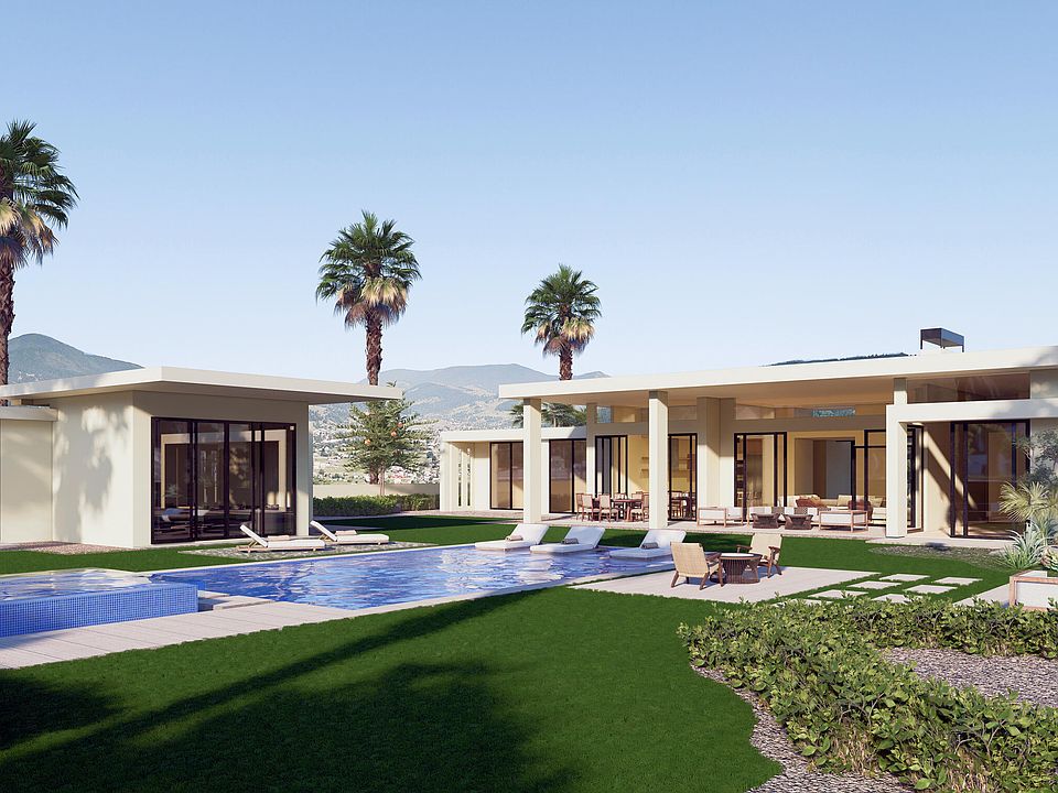 This modern luxury new construction home, located in the prestigious guard gated community of Villaggio is designed to balance space and functionality while seamlessly blending indoor spaces with its outdoor environment. With clean architectural lines and large glass openings, the property is flooded with natural light. A blend of wood, concrete and stone finishes create an organic and warm modern ambiance. Situated on a 1/2 acre lot, the property presents 3 bedrooms + office/den in the main house and two additional bedroom suites + living room in the detached guest house. The split floor plan with excellent separation of bedrooms offers exquisite space and privacy, making this property a true entertainers delight and offers the perfect setting to enjoy a luxurious desert lifestyle.