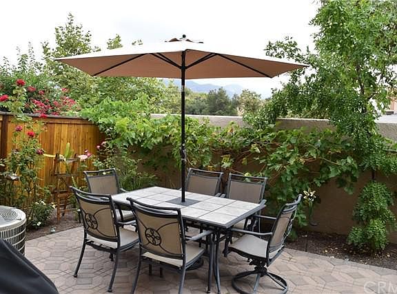 Gorgeous VIEWs of the canyon and Saddleback Mountain! Enjoy these panoramic views from your balcony off your master bedroom, very private. Living room features laminate floors, gas fireplace, and high ceilings. The dining room with a slider out to a nice size patio constructed of newer pavers, fruit trees and fountain are there for you to enjoy. The kitchen is updated with, Corian counter tops, pull out drawers, large range, microwave, Bosch dishwasher, Bosch refrigerator (included with no warranty), plenty of counter and storage space. The kitchen opens to both the dining area and family room (being used as an office). The master bedroom is large with great natural light, it also has a large bathroom with walk in closet. 2 Car attached garage with 1 additional permitted open space. Enjoy the community pool & spa. This property is close to shopping, dining, and hiking trails. Everything RSM has to offer.