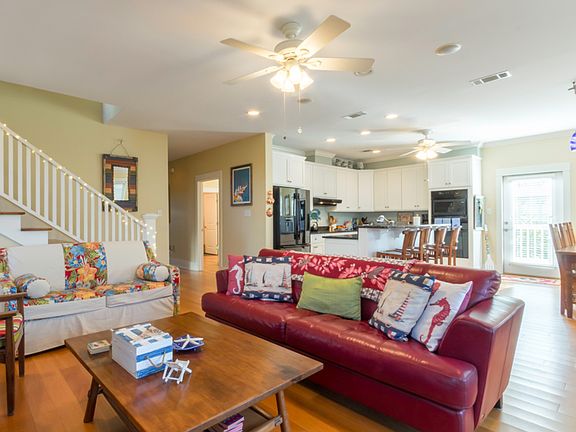 Quality Construction with Deeded beach access, 5 car garage, porch off master, most rooms with water views, gnat proof screens on porches. 2 Fireplaces. Elevator. Sunroom that could be a 5th sleeping area. Fenced yard. Deck off of kitchen for easy grilling. Furnishings negotiable.