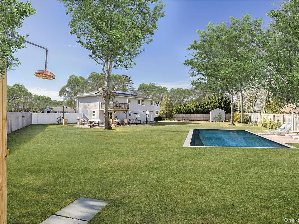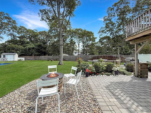 Located in a quiet cul-de-sac just minutes from ocean and bay beaches, this beautifully appointed home is both a calm sanctuary and a vibrant setting for gatherings and summer fun. The upper level boasts a spacious open living room with fireplace, a dining area that comfortably sits 6, and a fully equipped enclosed island kitchen with additional seating. Off the hall, the primary bedroom has direct access to a full bath and two additional spacious bedrooms share use of that bathroom. The dining area opens to a balcony with comfortable seating overlooking the yard and pool. On the lower level, there is an additional bedroom and a spacious living/recreational space with sliding doors to the patio and a kitchenette & bar area. A full bath and laundry room complete this level. Outdoors, the fully fenced yard houses a large patio with multiple seating areas from comfortable couches to an extra-large dining setting, BBQ, a heated pool, outdoor shower as well as a lovely spa shed, while the attached garage is outfitted as home gym. This home is filled with natural light and character, beautifully curated with sophisticated artistic taste. It is centrally located close to Southampton and Westhampton Beach Villages. Available for summer '26 as well as extended and off season.