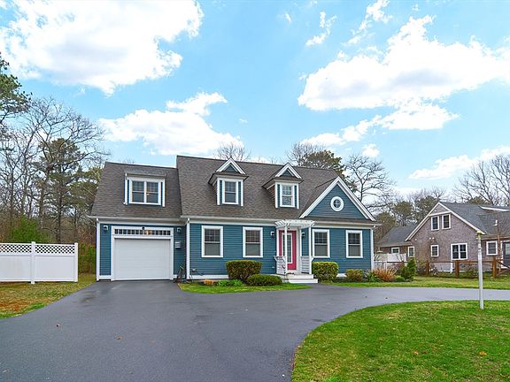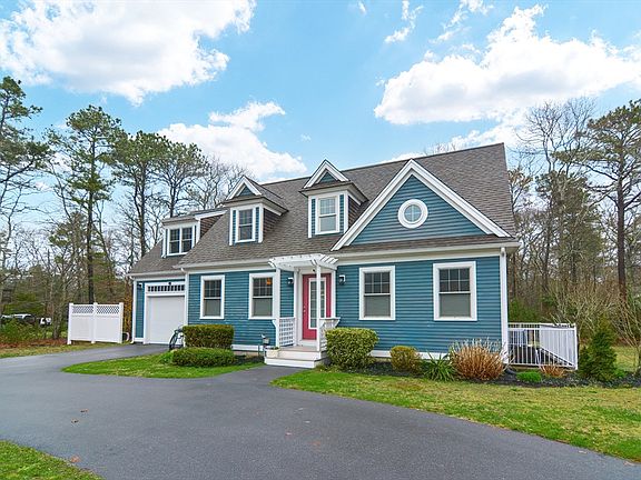 This classic 2 BR/2.5 BA home w/1-car garage and circular driveway on a wooded lot delivers all the charm of Cape Cod living including central a/c, and a large first floor Primary bedroom with cathedral ceiling, multiple closets and en suite bath. The inviting open concept living room has a gas fireplace and hardwoods that carry into a lovely kitchen w/SS appliances, gas stove, center island and separate coffee bar with built-ins. You'll fall in love with the beautiful sun room with sliders off the kitchen that lead to a large deck with privacy panels and an outdoor shower. Down the hall from the kitchen is a half bath w/laundry hook-up. Upstairs there is another Primary suite, a full bath and a large flex/bonus space with double closets that can be used for extra living space, plus separate space for a home office or crafting. Conveniently located near Mashpee Commons and just a quick drive to Mashpee Wakeby and Johns Ponds & area beaches. Schedule your showing today!
