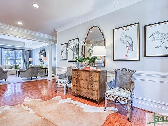 Grand foyer opens to Dining Room & Living Room with gas fireplace and picturesque water views. This elegant stucco home boasts a beautifully renovated gourmet kitchen, featuring gas Wolf stove/oven, marble countertops, and butler’s pantry/bar. This open-concept design seamlessly connects the kitchen, breakfast area and family room, where panoramic views of the private backyard and lagoon create a serene retreat. The spacious primary suite offers two walk-in closets and a luxurious en suite bath. Two additional bedrooms on the main floor provide convenience, while a 4th and 5th bedroom/bonus room upstairs offer flexibility. Enjoy resort-style amenities, including a dock, boat ramp, pool, tennis and basketball courts, and a playground. This exceptional home blends elegance, comfort, and natural beauty in one of Savannah’s most desirable communities.