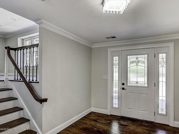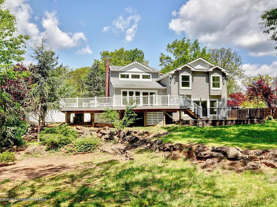 Great location, minutes from GSP 105, Monmouth Mall, Beaches. Quiet closed access street Spacious 4 BR home with lush landscaped terraced back yard. Elegant hardwood floors throughout. Bright sunshiney windows. ALL MEASUREMENTS APPX Beautifully appointed 450 s.f. eat-in kitchen family area, gourmet granite counter tops, tile floors, designer cabinetry, sink/bar area, newer appliances. Crown mouldings. Sliding door access to 800 s.f. raised deck with gas barbecue. Eye-popping 600 s.f. family room with sliding door access to 400 s.f stone deck and yard. Crown mouldings. LR 20X14. Crown mouldings. Bright windows Master suite: vaulted MBR ceiling, luxurious sunken whirlpool tub, stand alone shower, huge walk-in master closet. BR1 12X13 BR2 10X11 BR3 17X19 Finished