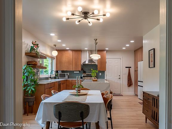 The heart of this home is its updated kitchen, featuring modern appliances, a large waterfall countertop island, coffee bar, & a dining area perfect for entertaining. The spacious living area offers warmth with a wood-burning fireplace (new chimney liner & recently serviced) & accent wall.