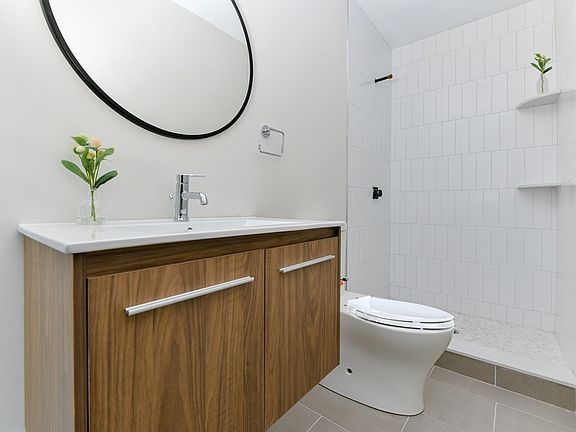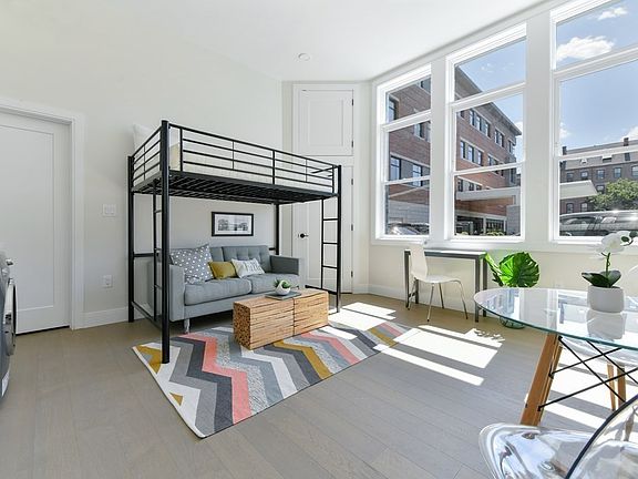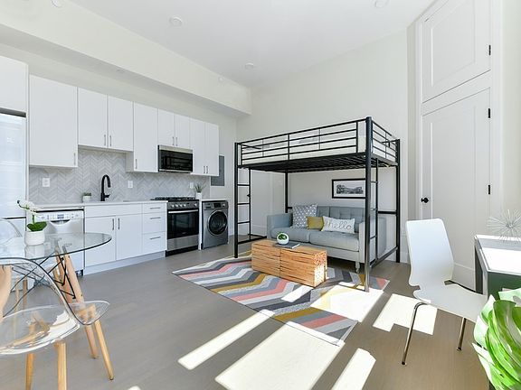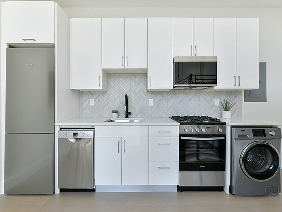 Minimalists wanted! New construction open concept studio features 14 foot ceilings and oversized south facing windows bursting with sunlight. This loft-like space is highlighted by a contemporary kitchen with chevron porcelain backsplash, quartz countertops, slide-in gas range, Bosch glass door refrigerator & dishwasher. Living/sleeping area includes a floor to ceiling closet with upper storage and plenty of wall space for additional storage systems. Large modern bath has a tiled walk-in shower & floating vanity. Additional features include in-unit washer/dryer, European oak flooring, LED down lighting, Central heating & cooling, Ecobee smart thermostat, video intercom, keyless entry and private basement storage. Off street parking is available for lease. Block 8 is pet friendly and located steps to Maverick Station on the Blue Line, restaurants, groceries, fitness, miles of waterfront amenities, green space and much more in the pipeline!