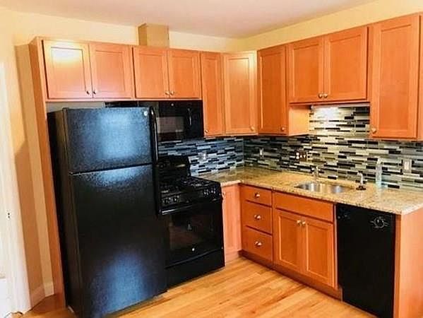 Well maintained and recently renovated 2nd floor 2 bed 1 bath in 4 unit house. Newer eat-in kitchen w/ hardwood floor, fridge, dishwasher, disposal, microwave, gas stove, maple cabinet, granite counters & custom tiled back-splash. Separate dining room w/ carpet floor. The bedroom and living room have carpet floors and ceiling fans. Beautiful tiled bathrm w/ walk-in shower. WASHER/DRYER IN UNIT. Back deck and ground patio space for use. Extra storage in basement. NO PETS & NO SMOKING on premises. Street parking only. Gas heating, hot water and electric ARE NOT included. Broker fee equal to 1 months rent applies.