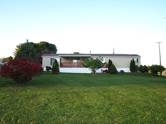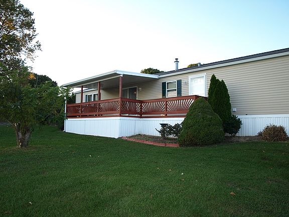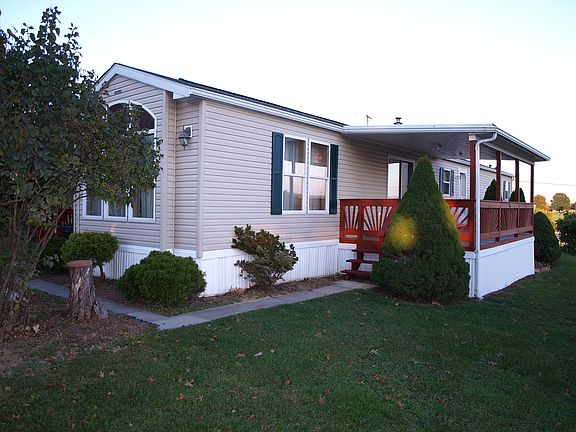 Like a New Home with a MILLION Dollar View! 70'x14' Pine Grove home with 20'x10' Addition and 20'x10' solid deck with sweeping panoramic view of countryside, farm fields and mountains. Largest lot in the community with mature landscaping and 2 car off street paved parking. Enter into the spacious family room with an added propane wall heater. Next you'll find an open layout seamlessly combining the kitchen and living room by a desired 1/2 step. Kitchen boasts 3/4" bruce hardwood floors, solid oak cabinets, double sink, dishwasher, propane stove, Frigidaire refrigerator, breakfast area and sliding glass doors out to covered deck. Brand New Carpets throughout the entire home start in the bright and cheery living room. Living room beams with natural light and ceiling fan. Down the hall are 2 bedrooms and 2 full baths as well as 2nd entrance and laundry room. Master suite with fresh paint offers a master bathroom with garden tub, double sink vanity, custom linen closet and his/hers closets in the bedroom. Nice sized 2nd bedroom and laundry area. Included is a 12'x10' garden shed with new roof, electric and built in workbench. 200 amp electric service, central A/C and high end Hydro Quad water purification system. 2 car paved, private parking pad. Largest lot in the community. Very Affordable lot rent is one of the lowest in the area and includes Water, Sewer and Trash. This is a must see home and community!