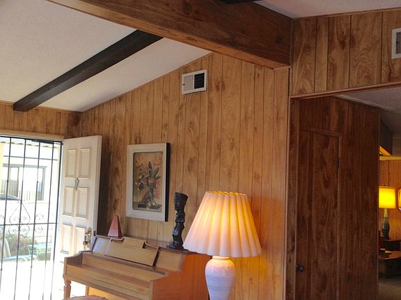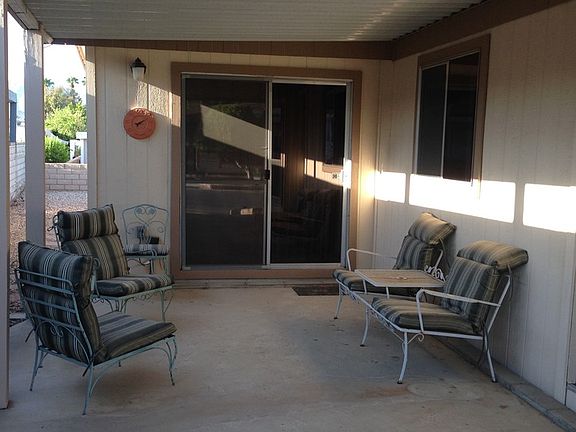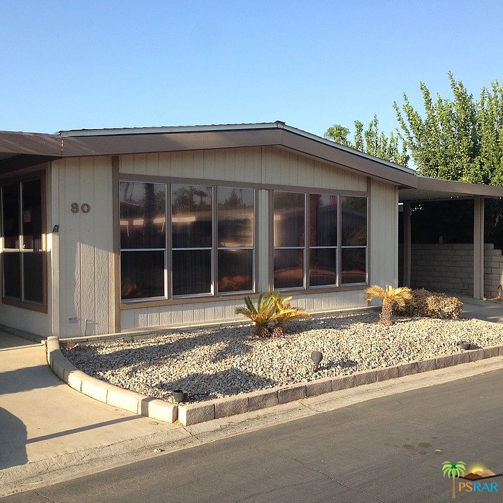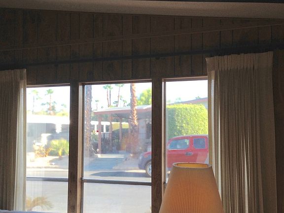Open floor plan. Two bed, two bath home, with living , dinning, and family rooms. Kitchen is open to family and dining rooms. Kitchen has 5 burner gas cook top. Living room has open beams with cathedral ceiling, with eight windows. Dining room has a built in china cabinet. Over size master bedroom, with a large mirror closet. Master bath has double sink, large soaking tub, and separate walk in shower. Large second bedroom, adjacent to second bathroom. Separate laundry room.Large carport can accommodate two + cars, and a roomy shed. Home has desert landscape, with several citrus trees in backyard. This park is rent control. The space rent is $640. Park has tennis courts, pool, spa, library, billiard room, fitness center, clubhouse, green belts, ponds/water feature, Chiropractor, and beauty salon.