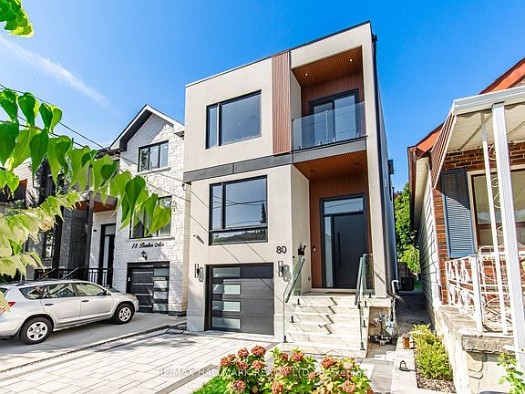 Welcome to this stunning custom-built home, showcasing 4+1 bedrooms, 4.5 bathrooms, a fully finished walk-out basement, and a built-in one-car garage with a private driveway that can accommodate two vehicles. Enjoy refined living spaces highlighted by sleek modern finishes and thoughtful design throughout. The open-concept main floor is filled with natural light and showcases 12.5 ft soaring ceilings, wide-plank hardwood floors, built-in speakers, and a striking floating staircase, a grand foyer with a large closet and powder room. A showpiece designer kitchen features a dramatic marble waterfall island, custom two-tone cabinetry, built-in panelled appliances, full-height marble backsplash, and modern lighting. The open-concept layout flows into a cozy yet sophisticated family room featuring a gas fireplace set against a wood-slat feature wall and a custom entertainment unit with ample storage. A massive 4-panel glass door leads to a fully fenced backyard with a new wooden deck, glass railings, paved patio, and lush green lawn. Upstairs, the skylit hallway leads to 4 bedrooms, including a luxurious primary suite with a walk-in closet & skylight, a spa-inspired 5-piece ensuite, and a private wet bar complete with a wine fridge perfect for late-night relaxation or morning coffee. A second bedroom features its own 3-piece ensuite with a walk-in closet, while two additional bedrooms, each with a closet, share a stylish 4-piece bathroom. One of the bedrooms offers a balcony. Laundry is conveniently located on the second floor. The finished basement includes a spacious rec room with a wet bar, an extra bedroom, a 3-piece bath, and a walk-out to the backyard, ideal for guests, a home office, nanny quarters, or in-laws. Located in a family-friendly East York neighbourhood close to top schools, parks, transit, and the vibrant Danforth. This home blends contemporary elegance with everyday comfort.