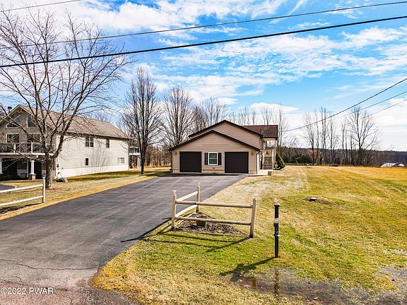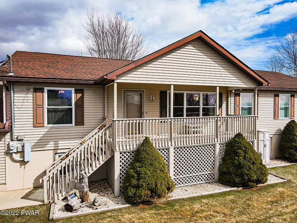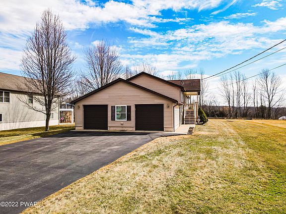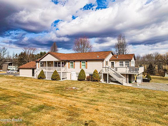 Beautiful ranch home with AMAZING views! Located in a four-season amenity filled community in The Northern Poconos, just two hours from the NYC and Philadelphia Areas. This spacious home has everything on one level, beautiful views from the sunroom and rear deck, covered front deck too! Primary bedroom with en-suite and walk-in-closet. Full ''mostly'' finished lower level with family room, potential bedroom, and large storage area, just needs some finishing touches. Hardwood floors, ductless A/C, corner propane fireplace. Paved driveway, huge two car garage. The amenities include lakes, beaches, pools, clubhouse with restaurant and pub, golf course, ski hill, tennis, indoor recreation complex with tennis/fitness center/arcade and more, basketball courts, ball fields, children's playground, miniature golf, walking trails, arts and crafts, a great recreation program including day camp for kids, campground, 24 hour security, gated access, must have an appointment with an agent to tour the community. The Hideout is a four season, Gold Star Gated Community with many amenities and planned activities and 24 Hour Security. There are several lakes which offer boating, fishing and sandy beaches. There are two heated pools, a kiddie pool, numerous tennis courts, basketball courts and ball fields. The golf course has a clubhouse with a full service restaurant and entertainment. There's a recreation center with a well-equipped gym, scheduled fitness classes, a game room with billiard and other table games. There's a woodworking building nearby too. At the main lake, there's a main lodge, a cafe and tiki bar open in the summer, an art center, and a ski hill/tubing area. There are events and activities for all ages! Fourth of July fireworks, and bus trips to casinos, antiquing and NYC. The Hideout has its own water and sewer utility. The Hideout is located about 15 minutes from both Honesdale and Hawley, where there is fine dining, shopping, recreation and medical care. Scranton is approximately 20 minutes away with even more choices, as well as an airport, The Yankees Minor League Team, Montage Mountain with water park and concerts in the summer and a ski resort in the winter.