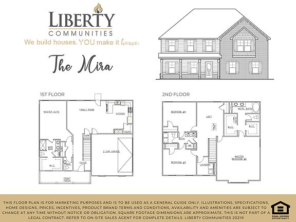 The Mira is a new, open concept plan with up to 4 bedrooms, 3.5 baths and a loft area.. This spacious home gives you not one, but two owner's suites - one on each level! Other plan highlights include: large, inviting family room, dining area and walk-in pantry. *Home information, including pricing, included features and availability are subject to change prior to sale without notice or obligation. Square footage dimensions are approximate. Sample elevation shown.