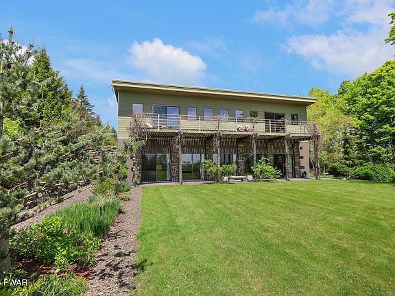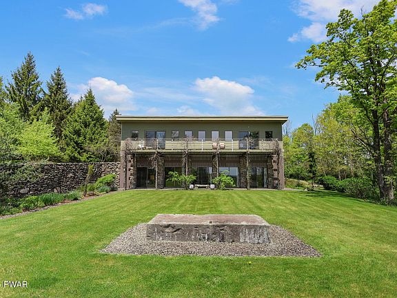 Introducing ''Springrock'' - a world-class modern Japanese-inspired masterpiece on 107+/- pristine acres with a large spring-fed pond. Featured in Elle Decor and Martha Stewart Living, Springrock is a true Passive Solar Estate nestled in serene seclusion just 2.5 hours from NYC or Philadelphia--only 15 minutes to Elk Mountain & 20 minutes north of Honesdale, PA-- This striking 4-bedroom, 3-bath contemporary home is an extraordinary fusion of city sophistication and peaceful country elegance. The main level showcases radiant-heated local bluestone flooring, soaring 12-foot ceilings, and a full wall of glass that fills the open living, dining, and kitchen areas with natural light and breathtaking views. Custom black walnut cabinetry and artisanal tilework are used throughout with exceptional care, reflecting a deep commitment to craftsmanship and thoughtful design. The second-floor layout is intelligently divided for privacy. One wing features an impressive primary suite with a luxurious tiled bathroom that opens to a sprawling south-facing deck--perfectly positioned for sunlight & serene vistas. On the opposite side are two spacious bedrooms, a fun bunkroom, and access to the same elevated deck to overlook your impressive property and majestic views. Luxury continues outdoors. A short stroll down the groomed trail leads to your pristine spring fed pond for swimming/fishing, enjoy more groomed hiking trails for berry picking and enjoying nature, gather around the fire pit with terraced stone seating for large gatherings, enjoy the large screenhouse for outdoor dining & late night lounging, be creative in your impressive detached garage/studio which offers room for vehicles, all surrounded by rolling lawns and lush gardens. Smart features include WiFi-enabled thermostats and locks. The triple parcel offers space to build a guest home or family retreat. Springrock is drenched in light, rich in architectural soul, & bursting with out-of-this-world details. Come see it today.