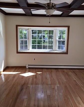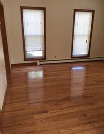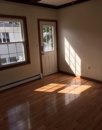 Living room, dining room and kitchen and 1/2 bath on first floor. Two bedrooms and full bath with laundry on second floor. Off street parking for 2+ cars included. One or two year lease with first last and security deposit. Good credit required. NO PETS AND NO SMOKING. Walk to middle School, Churches, Town Hall, Stoneham Square Stop and Shop. Property updated with Granite Counter tops and Hard Wood Floors. Available Sept. 1. Landlord will plow parking area and take care of Grounds.