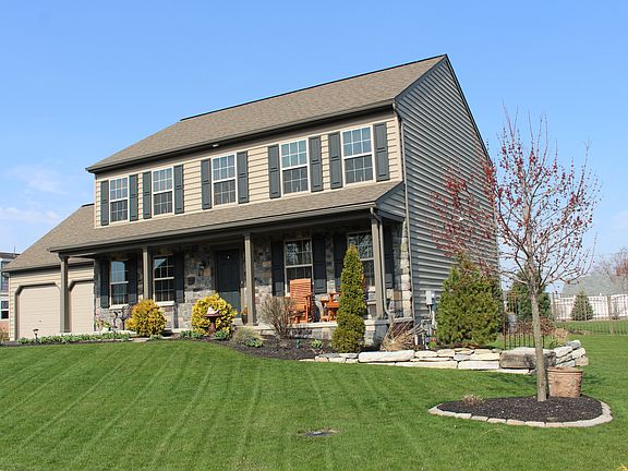 4 Bedroom, 2 1/2 Bath, .34 Acres. 3 Car Garage/Bonus Room. 2160 sq. ft. Like new home has been meticulously maintained and is a must see! Spotless hardwood floors in foyer and dining room lead to open kitchen with Granite center island. This home boast lots of storage space beyond the Master Walk in Closet and above 3rd car garage bay. Beautifully landscaped private back yard with Covered Porch and Stamped Concrete Patio. Spend your evenings relaxing on the patio listening to the waterfall and enjoying the serenity of the fish pond and the beautiful established landscaping. Large Cedar raised garden boxes ready for your spring gardening. No HOA. Located in desirable Stone Knoll Development. Palmyra School District. Please call (717)473-3344 for a showing appointment. Realtor friendly.