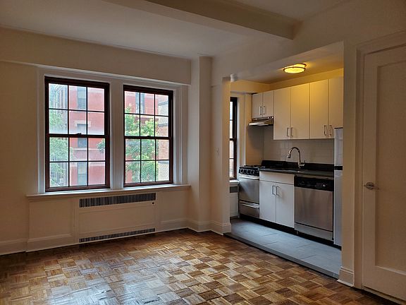 Spacious foyer, apartment features two closets. An open kitchen with full-size stainless steel appliances; copious storage space in the windowed kitchen and good size countertop space. Yes, a dishwasher. No Island as on the photo. Tenants may purchase one at a furniture store.