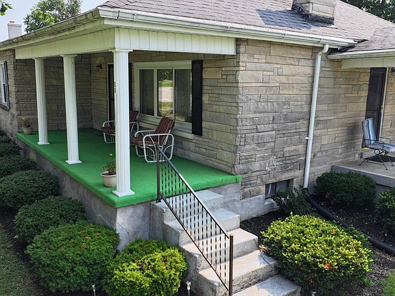 Bedford Stone house on small quiet road. 1212 sq. ft. of living space. 2 bedroom, 1 full bath, nice sunroom with heat, cozy living room with fireplace, cedar lined closets, large attic for storage, full unfinished basement. Nice backyard for cookouts and gatherings. 16'x28' detached garage.