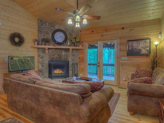 Welcome to Fireside, a cozy true log cabin home tucked away in the woods of the beautiful North Georgia mountains. All square feet of this private, well maintained home is being offered turnkey furnished for your convenience. Features include two wood burning fireplaces, one inside and one out on the screened-in patio, an eat-in kitchen island, a jetted hot tub, a large outdoor stone fire pit, main floor master bedroom suite and laundry and a secured owner's storage space.