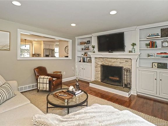 So much to love about 80 Deerfield Dr! A beautifully updated, pristine ranch style home situated on a picturesque landscaped lot in a quiet, cul-de-sac neighborhood. Pretty walkway and granite steps welcome you into the sun filled open floor plan with a Restoration Hardware flare throughout! Spacious living room with bay window, custom built-ins and a raised hearth fireplace adjoins nicely with the formal dining area. The eat-in-kitchen presents you with white cabinetry, granite counters and subway tile backsplash and leads to the perfectly staged main level family room with vaulted ceiling and skylights. Wonderful outdoor entertaining can be accessed from the dining room and family room overlooking level, fenced rear yard. The king size master bedroom offers a nicely updated full bath with stall shower. Two additional queen size bedrooms and a remodeled full bath complete the main living area. Lower level provides additional 300 sq ft of heated space, a half bath and loads of storage capacity. Wonderful amenities such as beautiful hardwood floors throughout, freshly painted rooms, gas heat, central air and a newer shed! The attached two car garage gives ease of access into and out of the home! Your lifestyle will be enhanced with the close proximity to beaches, parks, town green, shopping & restaurants and is unbeatable for both CT and NY commuters! A true turn key property awaits the next owner to just move in and enjoy!