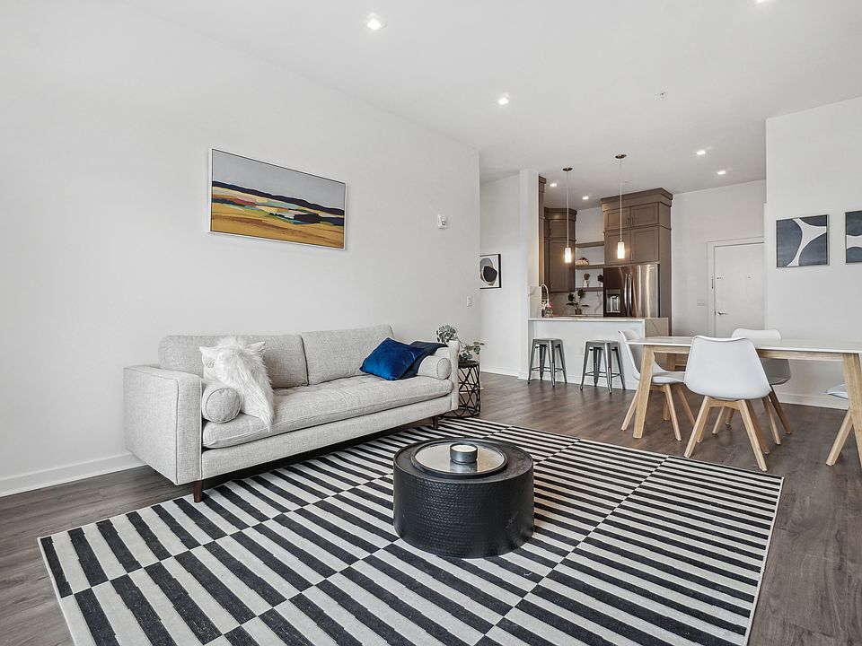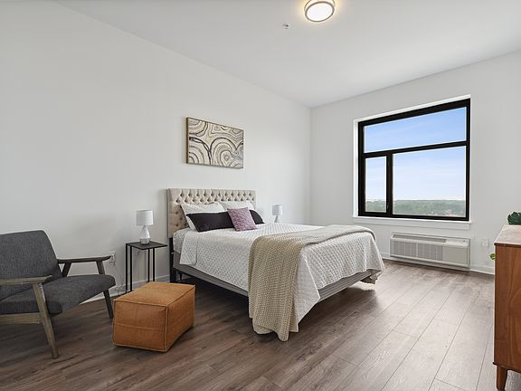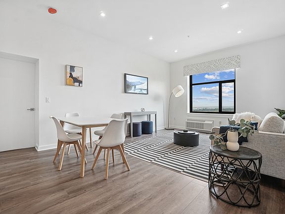 The Hoboken penthouse home features a spacious, open concept layout with 10+ foot ceilings, panoramic views, ample closet space and in-home washer and dryer.Adorned with the finest finishes, including solid wood, double-high cabinetry, full quartz backsplash, & stainless steel appliances. A graceful bath includes subway tile w/ single pane glass shower doors, a shaker-style vanity with quartz top & tile flooring and Greenguard certified wood-style flooring throughout.