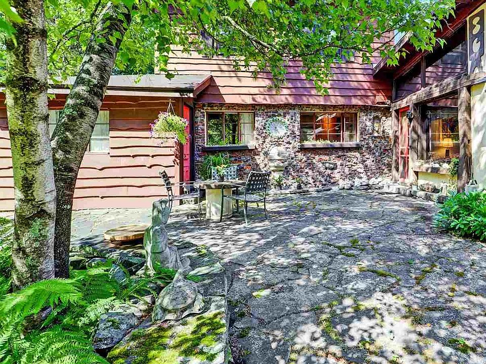 This unique Woodstock property is a truly rare and extraordinary find. Reside at the end of a quiet lane with total privacy, minutes from town, on an expansive 7.5 acre lot surrounded by soaring trees, lush gardens, abundant wildlife, and one-of-a-kind artworks. The main home was built in the 1950's by a local Woodstock artist and sculptor. The interior has been architecturally curated with vintage fittings throughout. There have only been two owners of this home, both were artists so the home has a unique flair that is a picturesque collage of styles including Italianate characteristics such as bluestone and brickwork. Isamu Noguchi was a friend and visitor of the original owner and now stonework inspired by him is dotted throughout the surrounding gardens. Custom features outside include Adirondack siding, milled from the property. Throughout the homes interior there are Victorian-era doors, a beautiful archway from Provincetown in the LR, and refinished oak flooring from a print shop in the main BR along with a Delft tiled fireplace. Oak flooring from NYC lofts, granite and natural tile are throughout the house. The casement windows have been recycled from the 1930's era, and stone quarried from the property surrounds the impressive LR fireplace. For the artistically inspired, there is a 12 x 30 art studio with north facing windows and high ceiling. Nestled on the property among flame-red maple trees is the original 150+ year old log cabin. Quite possibly, this is the last hand built 19th century log cabin in Woodstock and is a haven for original features and historical charm. This beautiful cabin has been completely restored by the current owner and would second as a fantastic office. The floors inside have been milled from the trees on the property. B&B visitors to the cabin have enjoyed this romantic cozy living space. Outside is an amazing glass sculpture studio with windows repurposed from a local greenhouse in Woodstock. There is an old forge that can be transformed into perhaps a potters studio, extra living space, or a green house. The location at the end of a lane in the Catskills ensures absolute peace and seclusion, yet you can walk to the local swimming hole and walk or bike into the town of Woodstock.