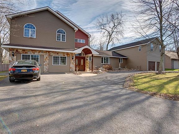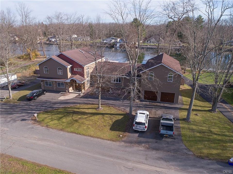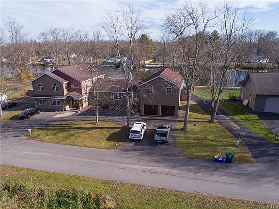 Majestic waterfront home features wall of windows looking out to Oneida River views in all different angles. Two story entrance foyer greets you! Spacious chef's kitchen with new custom cabinetry, concrete counter tops, tile back splash & all new stainless steel appliances. Kitchen boasts vaulted ceiling, dining room, sitting area w/fireplace. There are 2 bedrooms and 1.5 baths on the first level. There is an additional 1100 sq ft of finished living area with second kitchen can be converted to an in-law suite or a state of art work at home office. Second floor master en suite has a brand new walk in shower, balcony to capture sunset view. 2 additional bedrooms and a full bath. Basement is totally finished. Trexx deck surrounded the whole backyard w/entertaining space, basketball court & boat dock for summer fun under the sun. Great outdoor space for cook out & family gathering. There is a 4-car garage & a loft above the new garage can be finished. House has been totally renovated w/new vinyl siding, all 4.5 bathrooms have been newly remodeled. Freshly painted interior. House shows well in mint & move-in condition. There is a circular driveway! Truly a gem for all season!