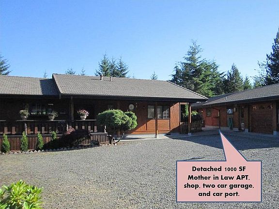 Combined square foot of living space=2,619. This private, well constructed, country home, sits near Elma, WA in the county of Grays Harbor. It sits directly across from the GHC Fairground/raceway, and 1.5 miles from the new Mark Reed hospital project (completed in 2013). This multi-family property is perfect for a family who needs some extra living space for mom or maybe an adult (boomerang) child returning home. Perfect for medical professionals who need to be close to the hospital and need an extra APT to rent to subsidize the mortgage payment. Home features open design throughout, cedar wood A frame ceilings, live room through bedrooms carpeted, central air/heat, gas fireplace, wrap around patio, large bathroom, wood flood bathroom, laminate tile in kitchen with tile counter tops. The property includes a (detached) mother in law (studio) APT; detached shop, w/garage and carport. Mother-in-law APT features private entrance, A-frame, cedar ceiling in main live area, bedroom and bath, large full bathroom, acoustical/sound room for distortion free recording, separate utility room and heated floors. Garage has room for two cars & shop, hot/cold water, toilet and thermostat controlled heat. Covered carport comes in handy for extra cars and equipment. Must see to really appreciate its beauty. Hot tub in the backyard helps to calm the nerves.Call me directly if interested, will do background check and handle all contracts.
