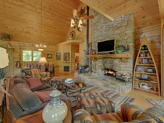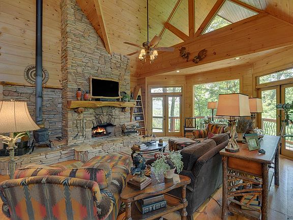 MAGICAL MOUNTAIN TOP CUSTOM LOG HOME SITTING ON 5.39 ACRES BORDERING NATIONAL FOREST. TOP OF THE MOUNTAIN AND END OF THE ROAD PRIVACY! FURNISHED! Sensational upgrades including stainless appliances, chiseled granite countertops, copper sinks in kitchen, cherry cabinets, handcrafted tumbled marble back splashes, soaring stacked stone wood burning fireplace, main floor master with double fixed glass doors leading to deck with Stone Fireplace and incredible views, whirlpool garden tub, travertine shower, double vanities. Lower level has large game room with fireplace two additional bedrooms, full bath walk out patio and fenced area for pets. Detached 2 Car Garage with storage above.