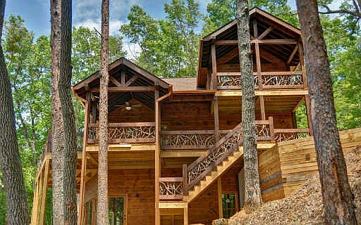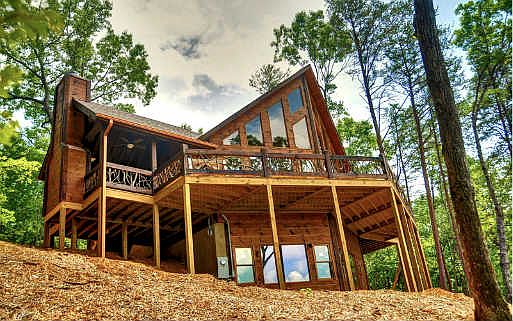 Stunning Like New Cabin in Aska Adventure Area... close to historic downtown, USFS trails & Toccoa River...craftsman quality with rustic flair & distinct detail...4 bedroom/3 bath style cabin is perched on large wooded tract with towering hardwoods & lush, gentle landscape, lavish living area boasts sky high ceilings & "wall of glass," massive stone fireplace in great room, unique & warm industrial finishes, plentiful windows, custom cabinetry w/granite counters, tile showers & baths, upscale fixtures & extras throughout...finished terrace level w/wet bar, den/rec room with fireplace & guest qtrs + cozy bunk room, oversize "party porch" features fireplace & relaxing views, multi levels of porches & decks are great for outdoor entertaining, easy access with plenty of parking in rustic gated community w/ultimate privacy, conveniently yet tucked away, fabulous fire pit and established rental history! Tasteful furnishings available separately for a turn key deal...A Step Above!
