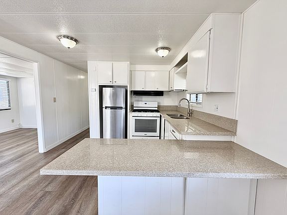 Welcome to your charming beach cottage in the heart of Huntington Beach, CA. Just a short walk to the beach, this beautifully remodeled 1-bedroom, 1-bath mobile home offers the perfect coastal retreat. Enjoy unlimited beach activities, including dining, shopping, surfing, and people-watching. Nestled in an all-ages community, this 1978 Skyline model boasts 705 sq ft of stylish living space. Step inside to find luxurious vinyl plank flooring that flows seamlessly throughout. The modern kitchen features elegant quartz countertops and a stainless steel sink, and comes complete with appliances for your convenience. Enjoy meals at the breakfast bar, dining area, or on your outdoor patio. The open concept floor plan is perfect for entertaining or relaxing. The bathroom features a convenient tub and shower combination, while the large walk-in closet provides ample space for clothes or extra storage. Outside, you'll find a generous side patio, ideal for enjoying the California sunshine and covered parking for your vehicle. This home truly is a must-see for anyone seeking a delightful and affordable beach lifestyle! Surf City Beach Cottages is a Premier Mobile Home Community located just Steps from the Beach, Shops, Restaurants, and other outdoor activities. This Manicured Mobile Home Community Offers a Sparkling Pool, a community center, and professional on-site management. Call Today, this quaint and cozy cottage won't last long. Renter is responsible for own utilities. 2 pet max. One year lease required.