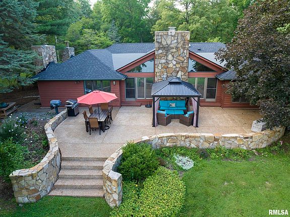 This exquisite 4BR home is nestled on a tree lined, 1.3 acre lot on the main body of Lake Springfield, perfectly framing incredible waterfront views. Lakeside you'll find 150' of seawall offers patio w/gazebo, 2 electric lifts & a boat dock w/roof new 2018. Luxurious outdoor living & entertaining space is highlighted by stone accents in multiple patios & walkways w/intricate details in freshly executed landscapes & brand new gazebo. Find hosting inside is just as gratifying while welcoming guests through a stunning marble foyer that sets an elegant scene. Sophistication in the layout includes both a library with wall to wall built ins & the vaulted great room with floor to ceiling windows & vibrant fireplace. The remarkable kitchen is adorned w/granite countertops & cherry cabinetry surrounding a center island & breakfast bar. Natural light pours in from a center skylight & a floor to ceiling cherry wood fireplace ties it all together seamlessly. The sunken master suite is truly a retreat of it's own. Majestic views through large windows combined w/stunning master fireplace to enjoy & fabulous full bath flawlessly finished w/walk in shower & tile surround, dual vanity & jetted tub. Numerous upgrades & remodels have kept this lakeside gem intact with refined charm & style. Features Dual furnaces, A/C units & h20 heaters with 1 furnace & 1 A/C unit new 2022 & a roof new in July this yr. This captivating Lake Springfield setting is walking distance to the Yacht Club!!