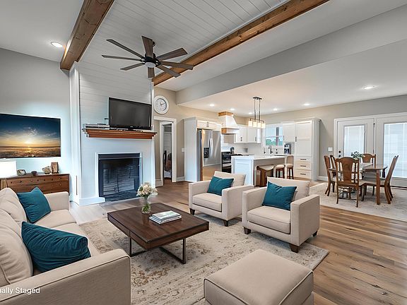 The open, split-bedroom floor plan includes a spacious great room with exposed wooden beams, a cozy gas log fireplace and electric blinds, a bright and spacious dining area, and a modern kitchen complete with granite counters, stainless appliances, tile backsplash, a large island, and under-cabinet LED lighting. The main-level laundry room is outfitted with built-in cabinets for added storage and convenience.