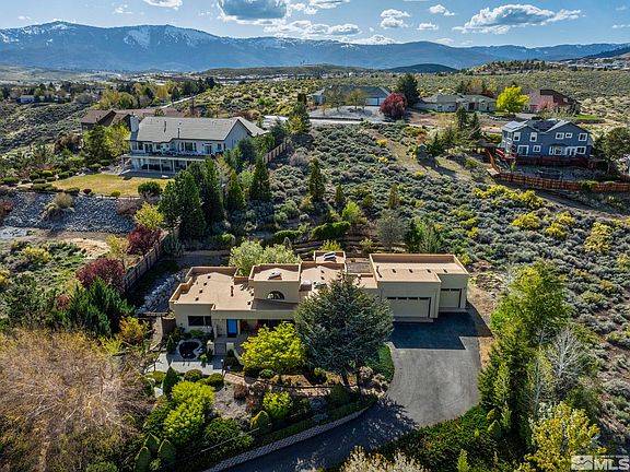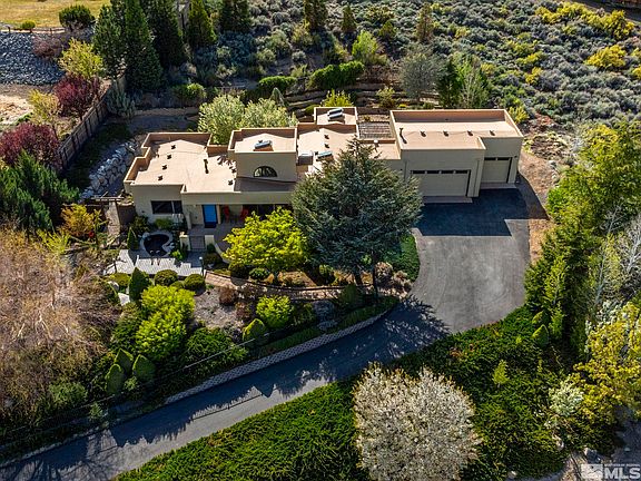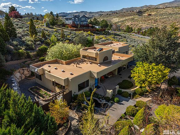 Custom Home with Panoramic Views, Exceptional Efficiency & Single-Level Living! Tucked away at the end of a quiet cul-de-sac in Reno’s desirable Mogul Highlands, 80 Mule Deer Ct is a custom-built, single-level sanctuary that blends smart design with serene mountain living. Set on over an acre of mature, meticulously landscaped grounds, this energy-efficient home offers rare privacy, spectacular views, and thoughtful features throughout., Constructed with insulated concrete forms (ICF) and finished with durable stucco, the home is exceptionally well-insulated—keeping energy costs low and indoor comfort high. Radiant in-floor hydronic heating provides consistent, comfortable warmth in every room. The open-concept living area showcases expansive windows that frame southeast-facing views of the manicured front yard, distant mountains, city skyline, and the Truckee River. A cozy fireplace nook offers the perfect place to unwind and take it all in. Designed for true single-level living, the home includes wide hallways and ADA-accessible bathrooms to ensure comfort and ease of movement. The spacious three-car garage offers abundant enclosed storage, and recent upgrades like a whole-house water filtration system and newer water heater provide added peace of mind. Outdoor living is a highlight, featuring a custom in-ground spa, built-in greenhouse/gardening room with water access, a natural gas BBQ hookup, and front patio misters to keep cool on hot summer days. The grounds are equally impressive, with raised garden beds for seasonal vegetables, thornless blackberries (yum!), and lush landscaping designed for year-round color and ease of maintenance—all supported by a full-property drip irrigation system. Nestled on the southeast side of a knoll, the home enjoys a natural windbreak and unobstructed views that enhance the tranquility of the setting. Located just 10 minutes from downtown Reno and 20 minutes from Truckee, this home strikes the perfect balance between privacy, comfort, and accessibility. Whether you’re drawn to the efficient design, breathtaking views, or the lifestyle it offers, this is a rare opportunity to own a truly special property in one of Reno’s best-kept secrets. Homes like this don’t come around often. Contact Far West Real Estate to schedule your private showing.