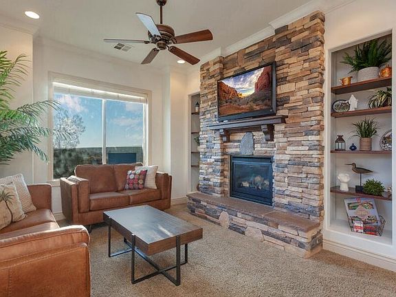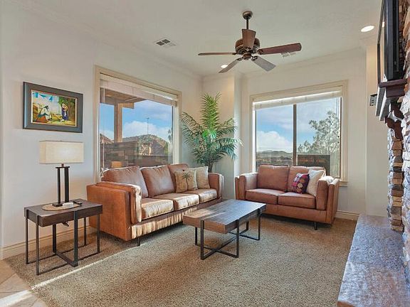 On the top floor and an end unit, this vacation rental in Coral Springs is a fully furnished 3 bed/ 2 bath vacation rental with a bright, light interior, 2 fireplaces, jetted tub, walk-in shower, 2 underground parking spots, and a short 1-2 minute walk to the complex amenities which includes an outdoor/indoor pool & hot tub, gym, half basketball court, and tennis court. New water heater, grill, paint, and 3 new TVs. This complex is seconds from the freeway with quick access to restaurants, gas, Zions, and downtown St George!