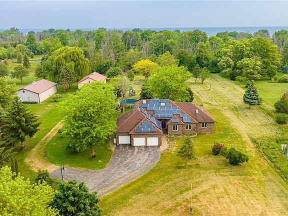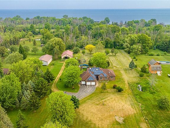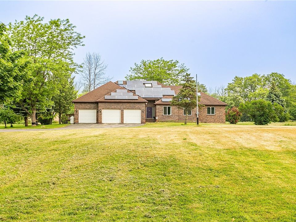 Welcome to 80 North Hamlin Road! OPEN HOUSE MONDAY JUNE 19th 5-6:30PM! You can't rebuild this custom brick Ranch home for this price! State of the art green technology runs throughout saving you substantially each month! Solar panels installed in 2015! Top of the line geothermal heating and cooling system! Pull into the large tree-lined driveway and fall in love with the incredible 5+ acre lot! Attached 3.5 car garage with pull-down stairs leading to the full attic adding tons of storage. Highly desired 36' x 56' Morton Building with electric, cement floor, and office space. The Paver patio, above-ground pool, and wooded back tree line all add to this wonderful setting. Bright and open floor plan offers 5 bedrooms and 3 full bathrooms with the potential for an additional bathroom on the 1st floor and future hookups in the basement. The primary bedroom has a large bathroom with double sinks, a walk-in closet, and extra flex space. The spacious great room features a stone fireplace and opens into the dining area and kitchen. Convenient 1st-floor laundry room/mud room. Huge 13-course basement with a partially finished room. Truly a must-see home!