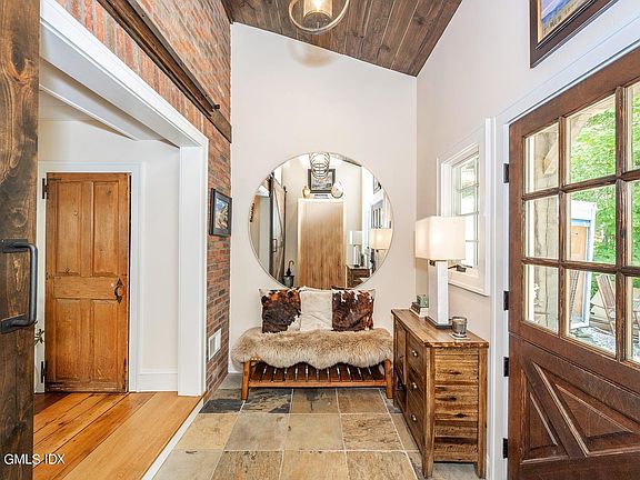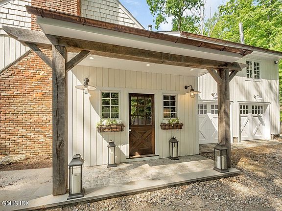 This recently refreshed post and beam circa 1787 barn originally from VT sits on 1.27 acres with views of the East Branch Mianus River. Moved and converted in the 1920s the property features reclaimed woodwork (kitchen beams) from a VT church from the late 1700's and reclaimed terra cotta floors from Mexico. Every facet of this home is loaded with character from the hand hewn beams to the antique fireplace. Originally an artist's studio, the house has had only a handful of owners since being converted. The new front porch and entryway leads you to a lovely foyer with exposed brick and a massive sliding barn door. The main living space with vaulted ceiling, refinished wood floors, and new sky lights offers a cozy living room with fireplace, reading space and spacious formal dining room.