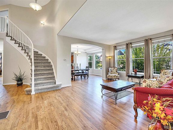 Fantastic opportunity in the desirable Erie Commons tree-lined community. This 5 Bed, 4.5 Bath home is perfectly located just steps from the Coal Creek Trail and Open Space on a corner lot in the quiet, eastern area of the community. Charming front porch leads to a grand two-story entry opening to a beautiful spiral staircase and hardwood floors throughout the main level. Convenient main floor office with French doors and built-in floor to ceiling bookcase. Formal dinning room with coffered ceiling and bay window easily fits a full sized dining table. Kitchen boasts slab granite counters, 42" cabinets, gas cooktop, and newer refrigerator, dishwasher & microwave, pantry, large island and breakfast nook. The family room has newer carpet, gas fireplace and an abundance of windows. Upstairs you will find the spacious primary suite with 5pm bath and extensive walk-in closet. 2 additional bedroom upstairs share a full bath and the 4 bedroom is an ensuite with full bath and walk-in closet. The professionally finished basement has a 5th bedroom with adjacent 3/4 bath, massive rec room with wet bar and hard wired for home theater, plus there is a bonus room that is perfect for music/yoga studio or even a 6th bedroom. The back yard features a covered patio with large stamped concrete patio that is fabulous for entertaining and enjoying spectacular Colorado summer evenings. 3 car garage, new interior paint, new roof in 2023, newer hot water heater, fully landscaped yard with numerous plants and fruit trees, main floor laundry with mud room & utility sink, newer carpet, all appliances included. Walk to everything with easy access to the community pool & splash pad, pocket parks, miles of trails, the Erie Rec Center & Library and even quick access to all the breweries, restaurants, coffee shops, Sweets Ice Cream, The Old Mine and shopping of historic downtown Erie - Hurry! * SHOWINGS BEGIN SATURDAY JUNE 1ST ***