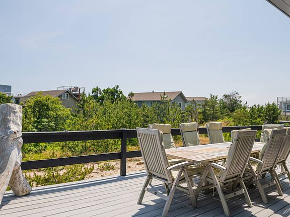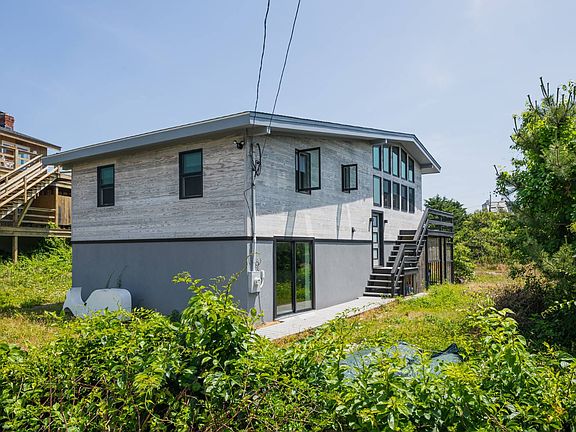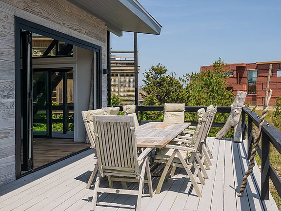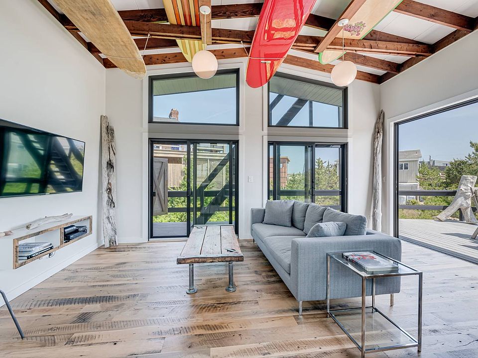 Rental Registration #: 23-1227 Located only 500 feet from an almost private ocean beach, this thoughtfully renovated mid-century modern beach home, reimagined with sustainable materials and high-end amenities, including a stunning display of vintage surfboards and weathered driftwood, has an upside down layout with a total of 4 bedrooms and 2 baths, 2 outdoor showers, modern glass folding doors that open up the great room to the 2nd floor dining deck, central AC, and a roof deck with 360 degree views of the ocean and bay. Easy access to the sandy beach around the corner in this Napeague Dunes Amagansett seaside community.