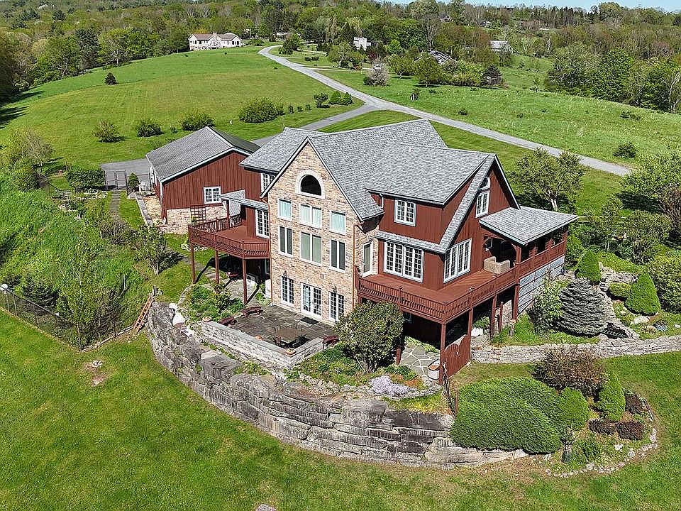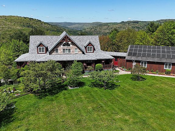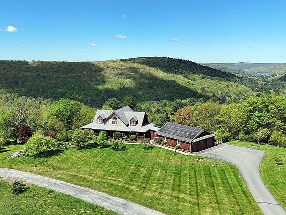 Could you live with stunning views of the Delaware River valley and the surrounding Catskills? Watch bald eagles and hawks glide past your windows? This Beechwoods contemporary is set in a hilltop neighborhood of upscale homes. Elegant Douglas Fir post-and-beam framing creates a high cathedral ceiling and open space. All rooms have soaring views of sky, mountains and the river. South and west siting provides all-day sun. Solar roof panels, low-E Andersen windows, and 4-zone radiant heat make for an energy-efficient home. Air conditioning is handled by a 2-zone ultra-quiet Fujitsu central system plus 4 Fujitsu ultra-quiet mini-split units, making a total of 6 AC zones. 5G cell service and Spectrum fiber-optic 1GB internet keep you connected, and a whole-house generator keeps you up and running. A wraparound deck, covered front porch, stone patio, and firepit provide easy outdoor spaces for relaxing, entertaining, and enjoying the view. With 4,682 square feet, 5 BRs, 3 full baths (new fixtures) and spacious rooms, you'll handle a crowd. Kitchen has granite counters and new/recent Bosch and Samsung appliances. New washer & dryer. Family room has a pool table, propane fireplace, built-in surround sound, and a home theater. Fully equipped gym also has a sauna. The 6-car garage is insulated, heated, and houses a Tesla EV charger. All mechanicals are high-end and were installed 2018-2019. A new roof was installed in 2019. A large, side-attached garden equipment storage room provides exterior access to garden tools and equipment. The grounds are both landscaped and wild, with multiple outdoor walking and gathering spots. Mature plantings, a pond, and a hiking trail enhance the natural beauty of this special Catskills retreat. Just 2 hours from NYC; 5 minutes from Callicoon and the Delaware River.