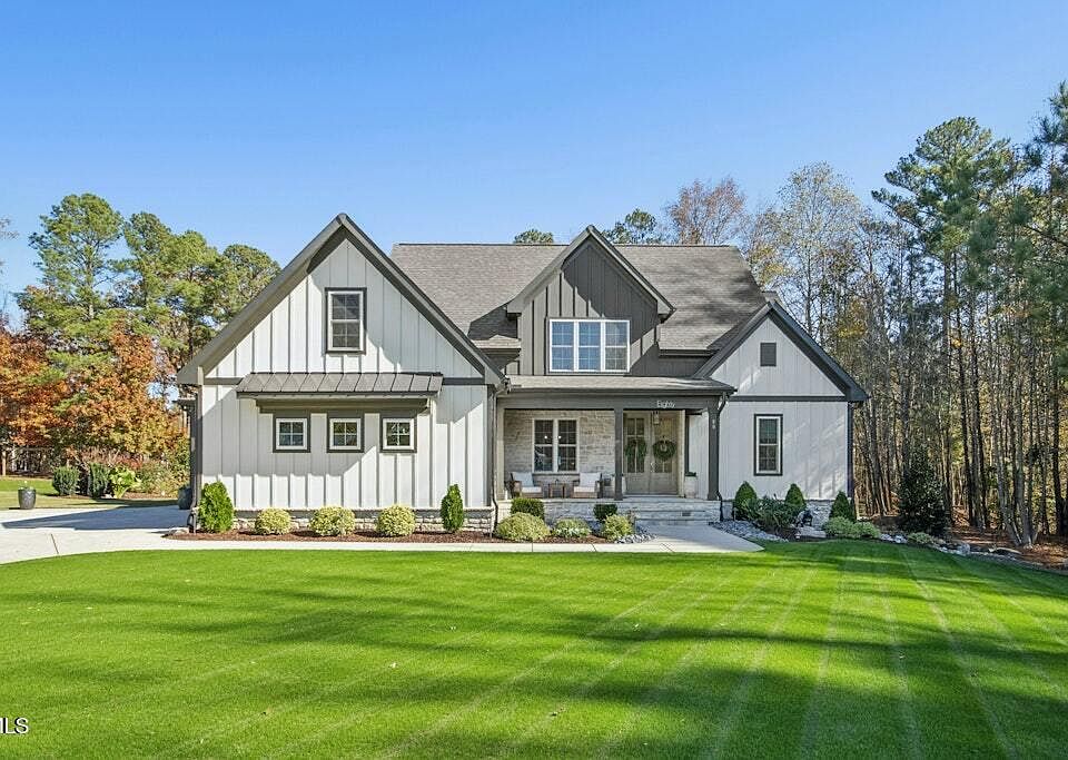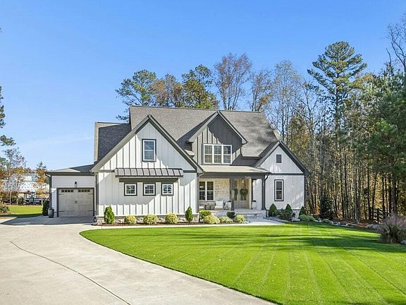 Stunning 2023 custom Modern Farmhouse by Brandywine Homes on private 3.13-acre cul-de-sac lot! Beautifully finished with tile + white oak hardwoods throughout, custom-painted cabinetry, craftsman trim, accent walls, arched doorways, & trey/vaulted ceilings with exposed beams. Chef's kitchen with quartz, soft-close cabinetry, large island, gas range, wall oven/microwave & under & above-cabinet lighting. Dramatic great room with gas fireplace and built-ins. Main-floor owner's suite with designer bath + 2 vanities; second main-floor bedroom with full bath. Upstairs: 2 additional bedrooms, office/flex room, bonus room, and 402 sq ft unfinished walk-in attic. Outdoor living is exceptional—15x12 screened porch, patio, covered front porch, extensive landscaping & lighting, irrigation, and ~20,000 sq ft of yard space surrounded by 2.13 wooded acres. Enjoy 100+ blueberry bushes, ¼-mile trail system with bridges, and custom 4-rail fencing. Finished 3-car garage, concrete drive. Spectrum WiFi & AT&T Fiber available. SEE ATT FEATURE SHEET FOR DETAILS.