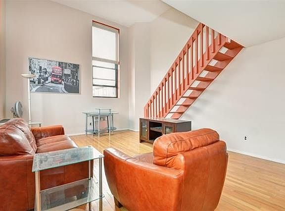 Loft Style living just few blocks to PATH! With over 1000 sqft of living space, this dramatic corner unit features huge Windows, Soaring Ceilings, HW flooring, & plenty of storage. Galley Kitchen opens to spacious Living/Dining area flooded with light. Upper Loft can be used as 2nd Bed or office. The popular Schoolhouse Condos are located on the corner of Park & Newark, Restaurants, Shopping & all transportation around the corner . Laundry on premises. All of this, & Parking too! Available 9/2/25.