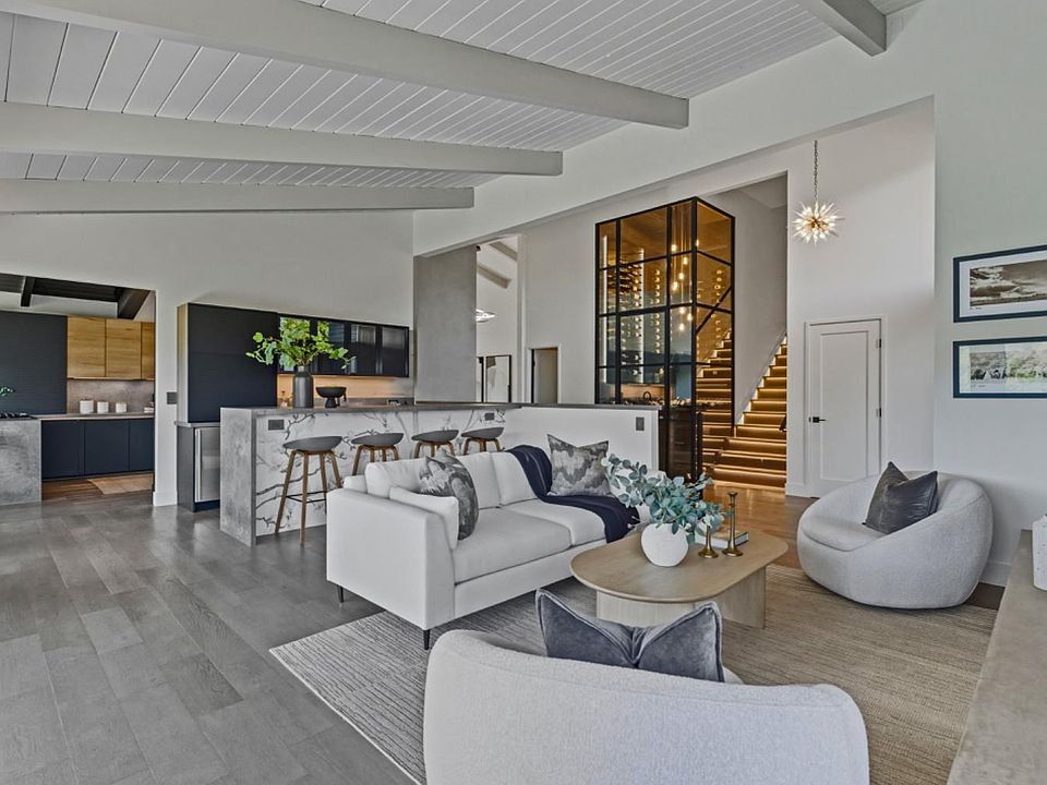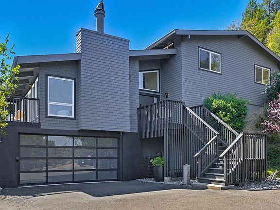 Set on a private acre at the end of a cul-de-sac, this extensively remodeled four-bedroom home blends modern design, resort-style amenities, and sweeping greenbelt views. Completed between 2020 and 2022, the renovation highlights wide-plank oak floors, a dramatic two-story smoked-glass wine room, a sleek wet bar, and a Venetian plaster fireplace. The chef's kitchen offers dual counters, custom cabinetry, a walk-in pantry, and an indoor grill, with effortless flow to the outdoor dining area, built-in BBQ, and view deck. The primary suite opens directly to a private outdoor shower and heated pool, while all bedrooms are conveniently located on one level. A ground-level office provides excellent work-from-home flexibility. The finished two-car garage features epoxy floors, full-height cabinets, a workbench, and integrated tool system. Professionally designed gardens are fire-wise, drought-tolerant, and low-maintenance, complemented by a mini orchard. The expansive lower yard is built for gatherings, complete with bocce court, powered greenhouse, raised vegetable beds. Located within the Wild Horse Valley Home Owners Association who's amenities include tennis courts, a community pool and clubhouse.