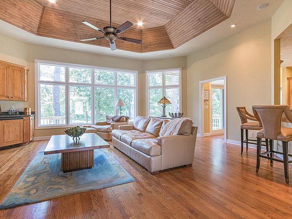 Stunning home! You will know this is a ''special find'' from the moment you enter the beautifully framed front door. Straight ahead is the Great Rm with planked Tray ceiling, walls of glass overlooking golf course, plus built in cabinetry with wet bar, wine cooler, refrigerator and more. Gourmet kitchen has induction cooktop range with convection and regular oven. Walk out to expansive deck/porch overlooking course. Owner made numerous improvements including, hardwood floors in all bedrooms, refinished hardwood floors in all main areas, planked ceilings in Great rm and Master, freshly painted throughout, upgraded lighting and ceiling fans throughout, refinished cabinets and painted island cabinets in kitchen, new electric Blinds in Great Room, Kitchen, Dining rm, new dimmer switches etc.